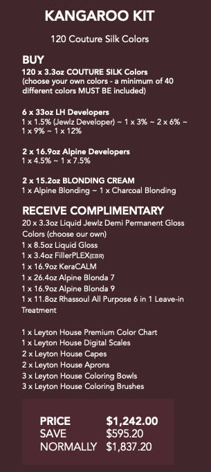 The Leyton House Kangaroo Intro Kit is a comprehensive professional salon colour package designed to fully equip your salon with the Couture Silk permanent colour system, Liquid Jewlz gloss, developers, lighteners, and essential tools.